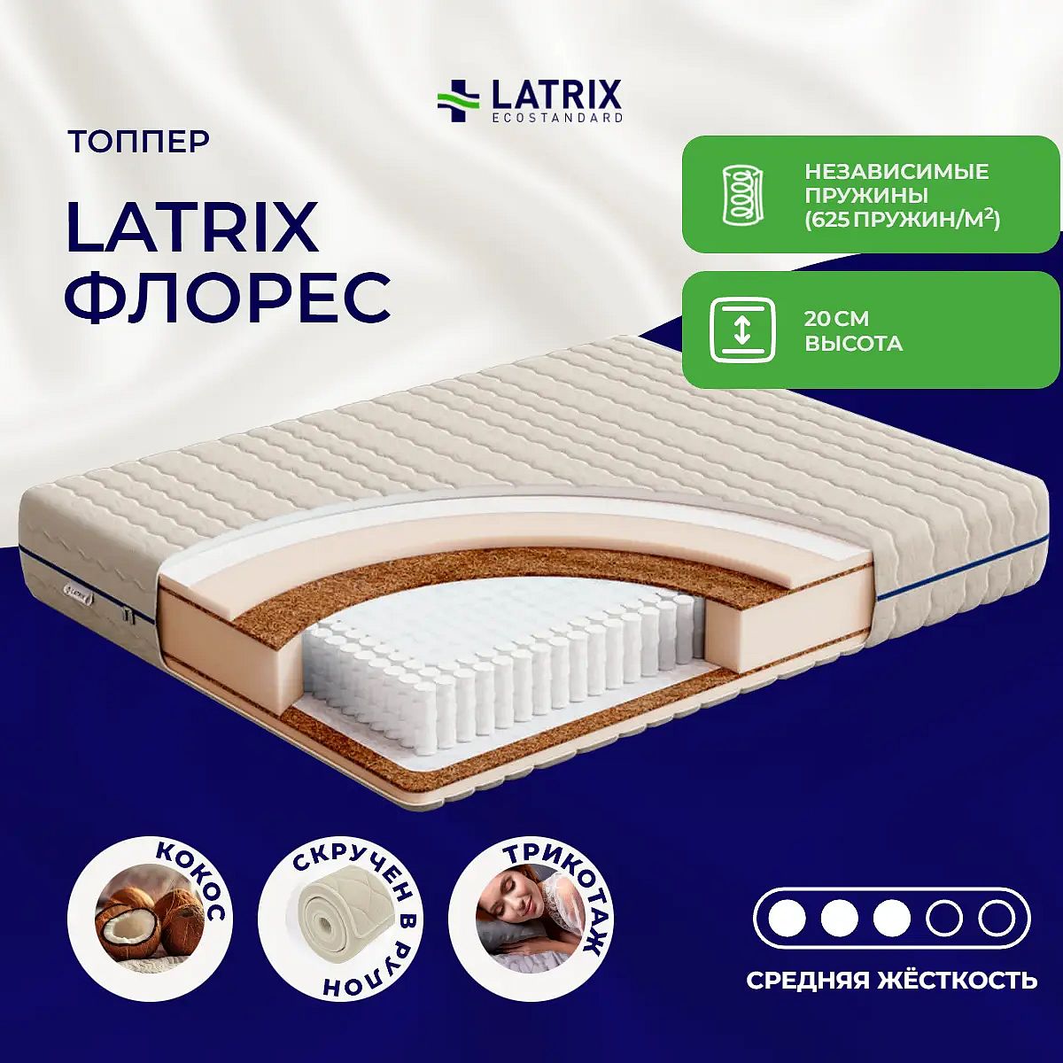 Матрас «Latrix Флорес» — средней жесткости, которая подходит большинству людей среднего телосложения. Это — универсальный вариант и детям, и взрослым, и пожилым людям.